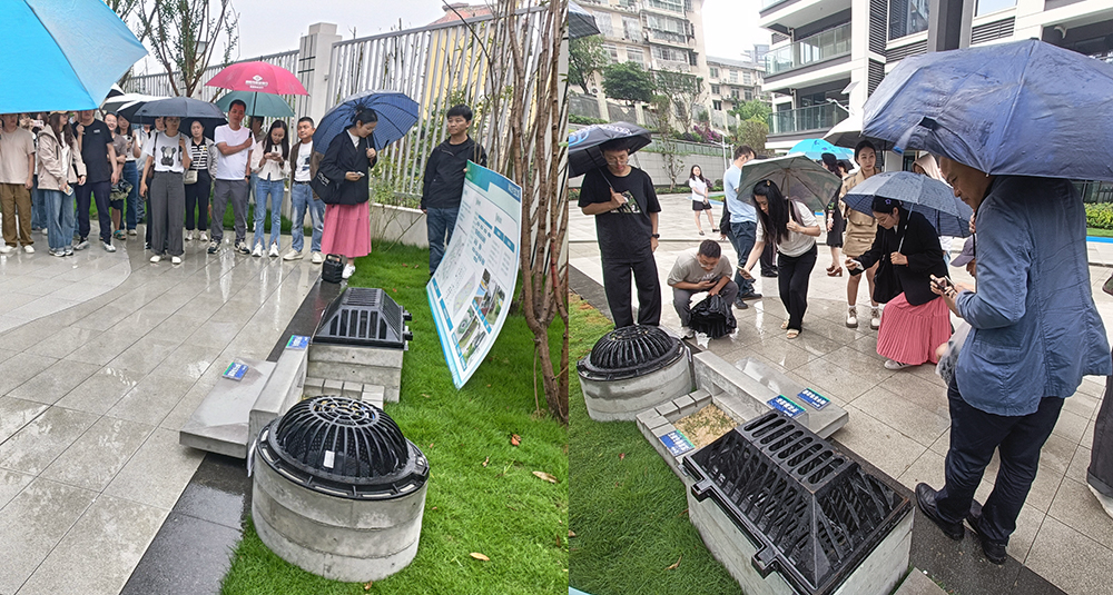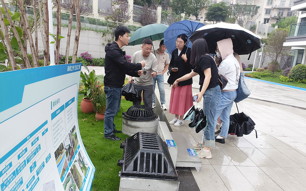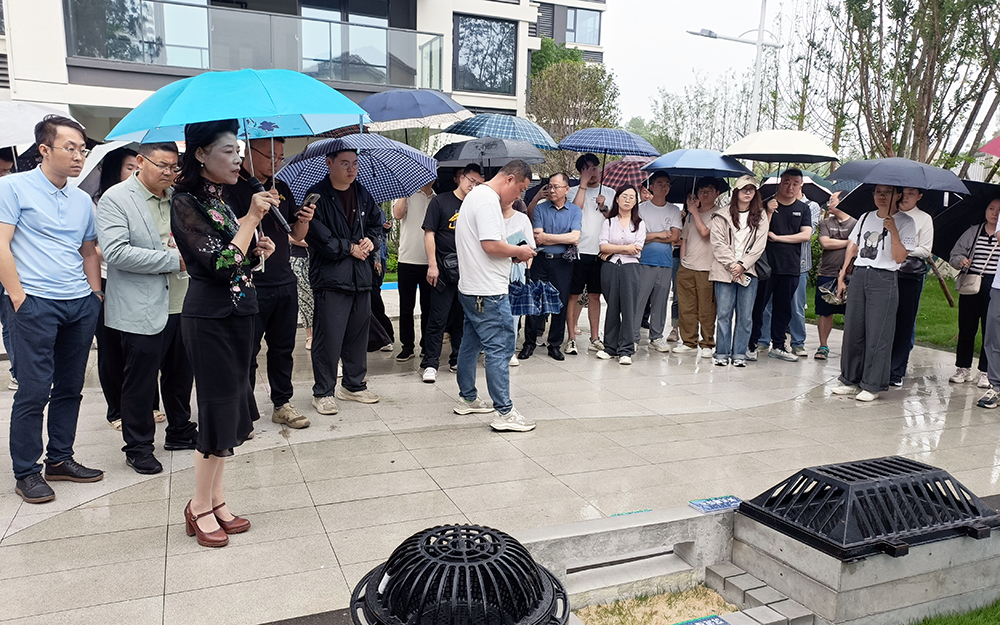 曾逢春副主任帶領參觀團一行深入小區(qū),查看了我公司自主研發(fā)生產(chǎn)的預制井座、側平石導流槽、開孔路沿石、沉泥槽馬蹄石等海綿城市設施裝式標準部品的實際運行效果。恰逢雨天,參觀團近距離見證了這些產(chǎn)品改善了小區(qū)生態(tài)環(huán)境,為居民創(chuàng)造舒適宜居的生活環(huán)境。